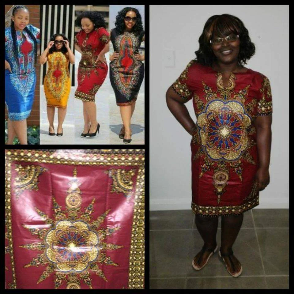 An example of a fully customized order: The customer wanted a dress in a similar style as in the photo in the top left with a similar Chitenge material. As we didn't have a matching material on stock we went to the markets in Ndola (Zambia) and got her the Chitenge material in the left lower corner.